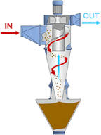 當含塵氣流由進氣管進入旋風分離器時,氣流將由直線運動變為圓周運動。旋轉氣流的絕大部分沿器壁自圓筒呈螺旋形向下沿錐體流動。含塵氣體在旋轉過程中產生離心力,將重度大于氣體的塵粒甩向器壁,沿壁面下落到底部卸料閥排出,將塵粒從氣體中分離出來的一種氣固分離裝置。