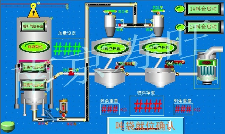 此控制系統(tǒng)為:噸袋卸料站+計量+輸送+除塵為一體的自動化設計方案。